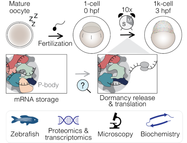 How is the embryonic proteome remodelled to transition from translational repression to initiation? What molecular complexes drive the activation of maternal mRNAs? How is translation initiated, and when do these events take place? These are some of the questions our newly established lab is currently addressing (Figure 2).