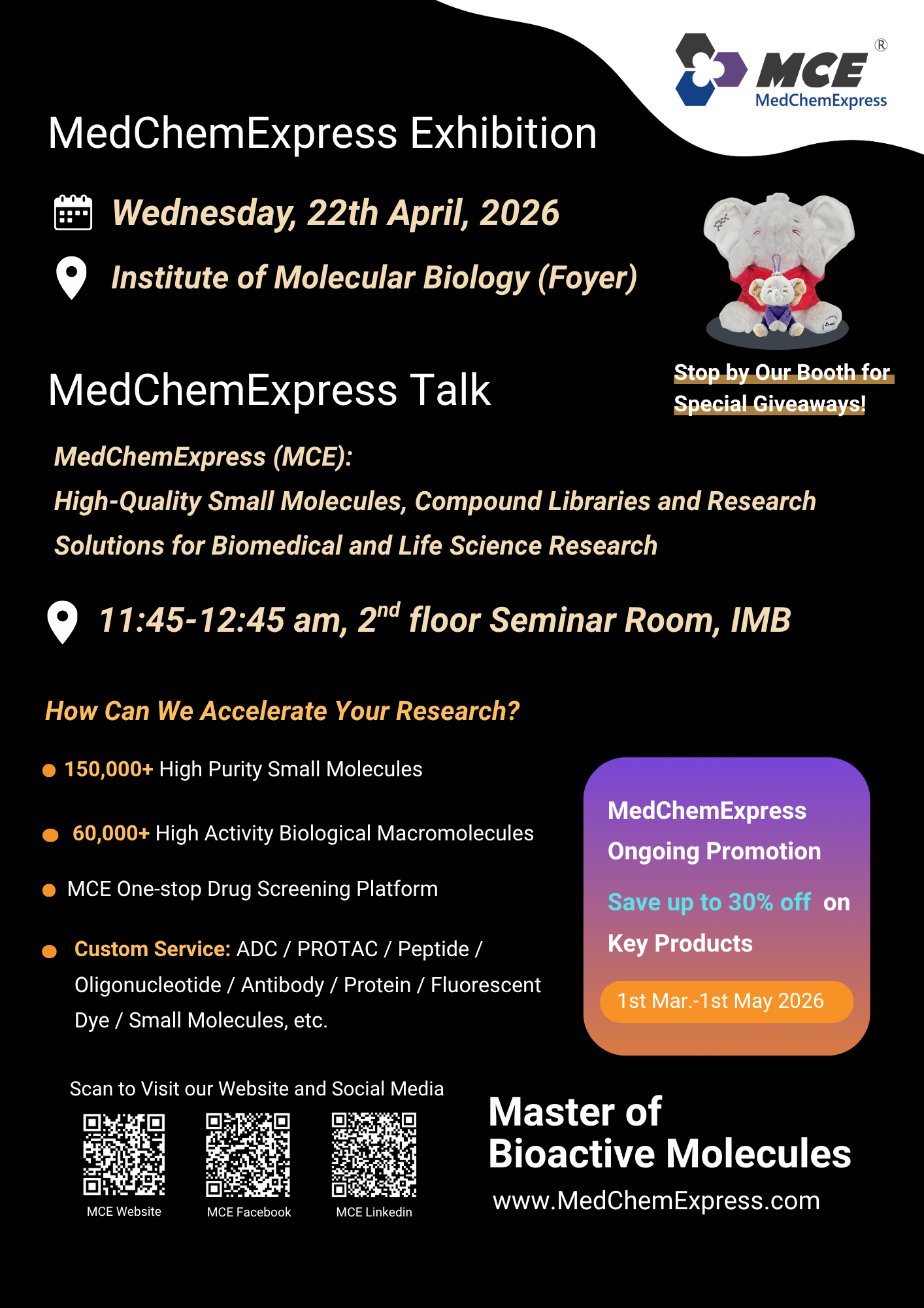 MedChemExpress will set up an exhibition booth in the Foyer on Wednesday, 22 April from 10:00-16:00.